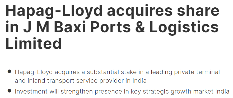 赫伯罗特收购了印度一家码头和内陆运输服务供应商的大量股份。