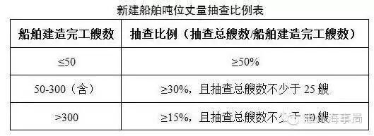 2016年5月1日起,海事管理机构停止新建船舶吨位发证工作(含已提请海事机构复核或海事机构已进行实船复核的船舶),采用随机抽查方式进行船舶吨位丈量检查工作。船舶检验机构应在船舶建造开工时通报建造地具有登记管辖权的海事管理机构,即对拟在直属海事管理机构登记的船舶应通报建造地的直属海事管理机构,对拟在地方海事管理机构登记的船舶应通报建造地的地方海事管理机构。同时,船舶检验机构应配合海事管理机构完成抽查工作。海事管理机构应建立船舶吨位丈量抽查工作机制,抽查中发现问题的应及时通报检验机构并督促其整改,同时建立船舶吨位丈量抽查台账和档案,抽查比例见下表: